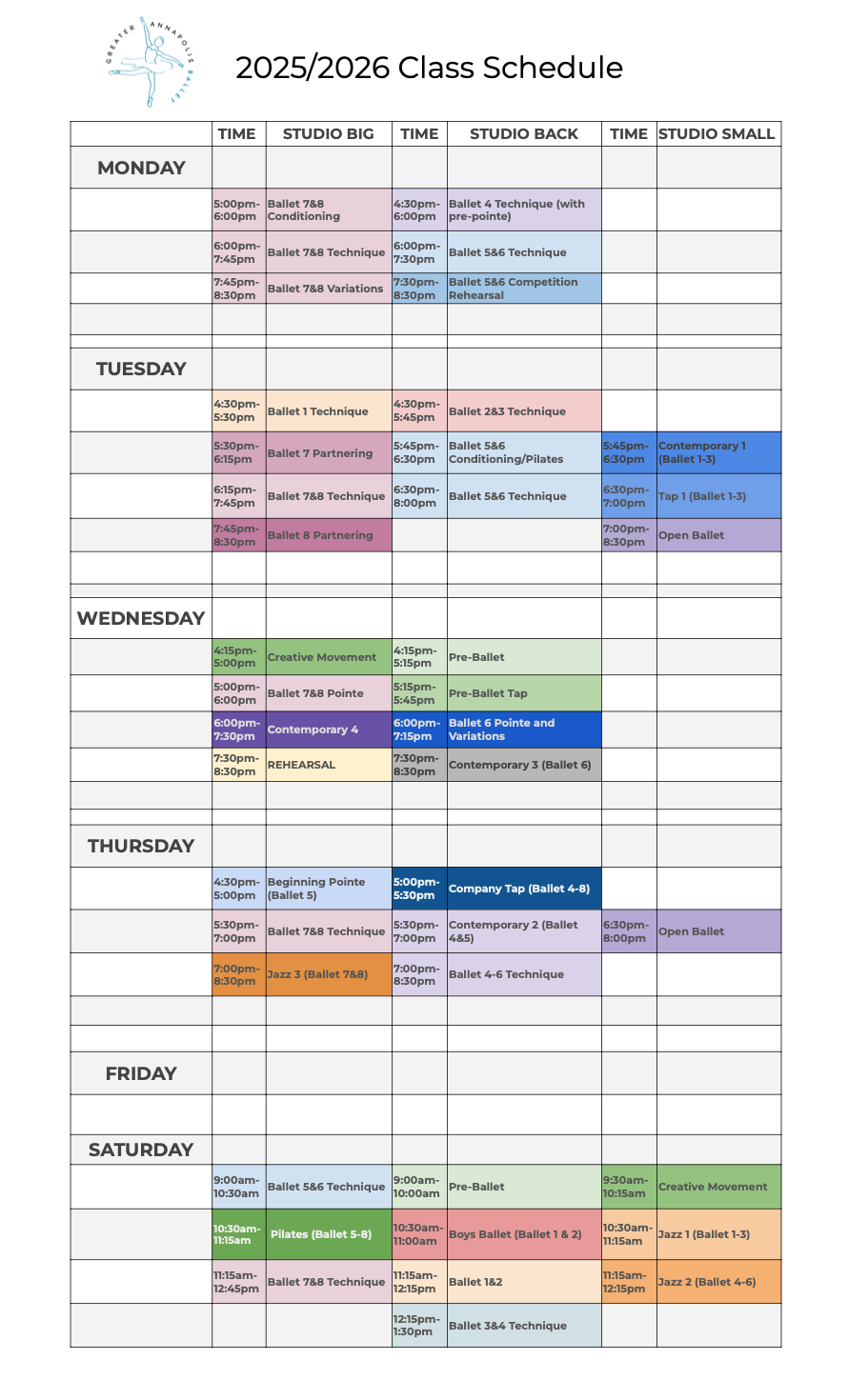 Classes: Contemporary, Tap, Jazz, Boys Ballet, Conditioning, Open Ballet